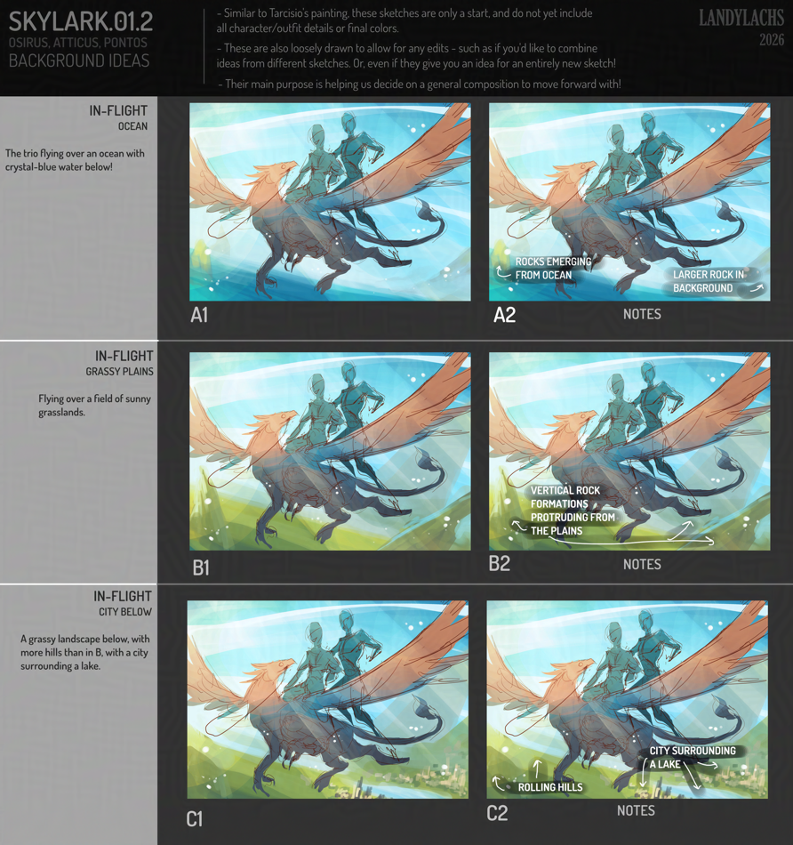 Initial sketches.Revised sketches after client feedback.Refining the underlying sketch before starting painting!