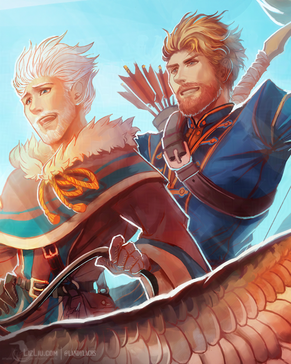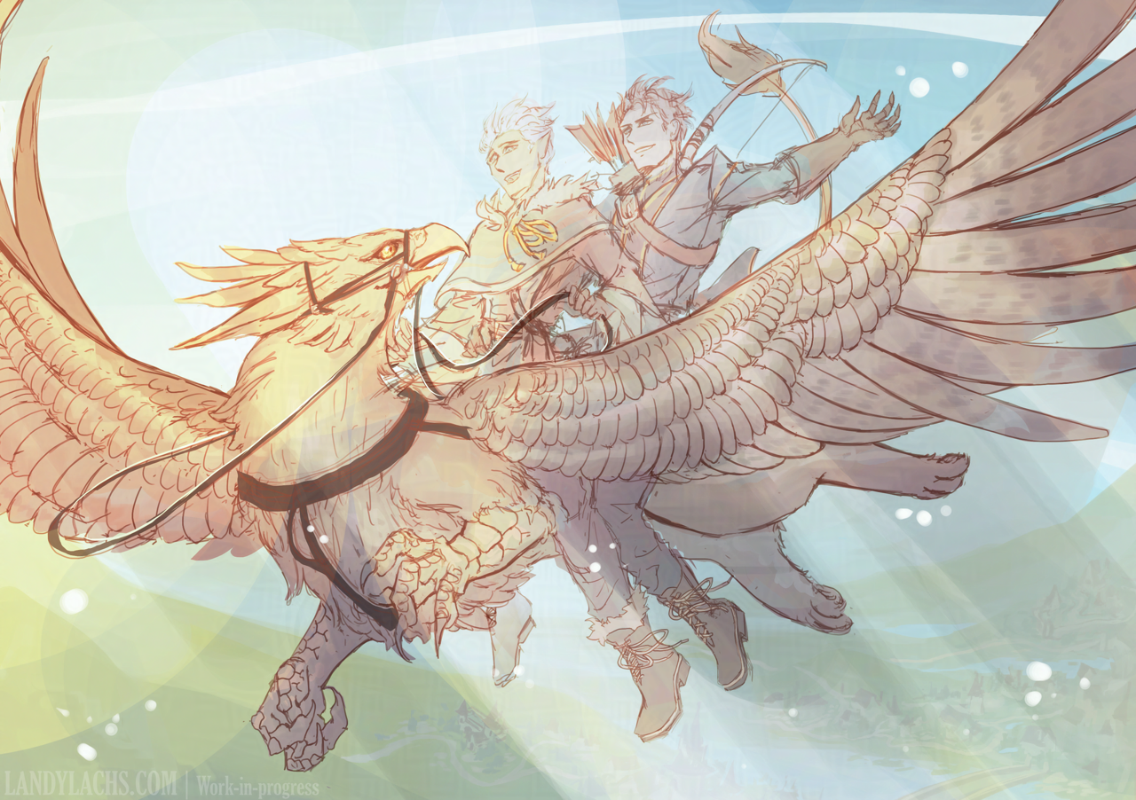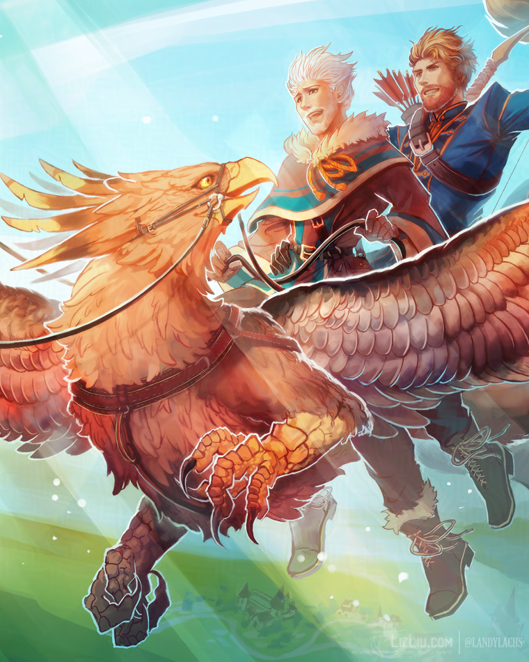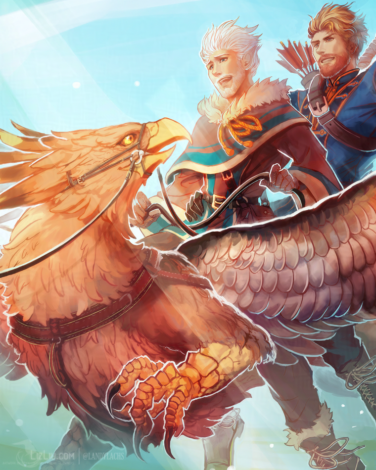Recently finished “Tier-2 style” commission for Skylark celebrating this year’s anniversary with their partner! Their DnD characters – Atticus in the back, a solider; Osiris up front, a sorcerer; and Pontos – Atticus’ trusty griffon!