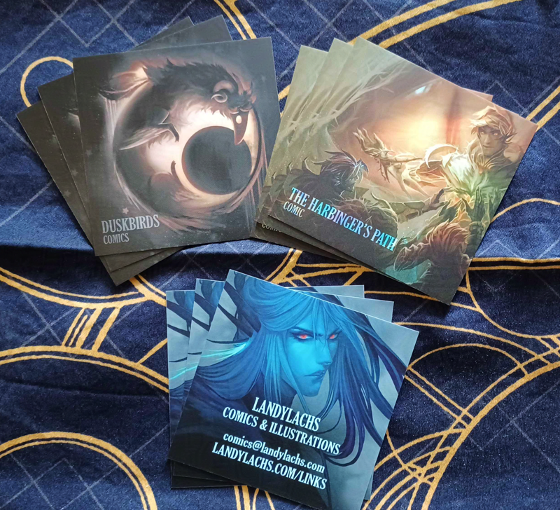 My first and easiest thought I had were contact cards (or “business cards” – though it feels funny calling them that since these are intended for art conventions). Business cards are easy to print, and I’m always very happy with the quality from the printer I use for them (it’s Moo!). I haven’t printed their square business cards before, and was a bit curious about them. This seemed like the perfect opportunity, because aside from contact info, I was interested in the backs potentially being good mini-art samples I could show. Especially for the side with The Harbinger’s Path cover on it, since Harbinger’s print version will be finished for May’s convention, and not this April one.