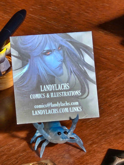 You might have seen the above artwork of Arquel here and there. I’ve posted a crop of it before, and I use it as a profile photo for some of my socials. I quite like this painting of him, but it’s been unfinished for a while. Other projects have arrested my time. While still not entirely finished, entirely because of this convention, I refined it to the point where I was comfortable printing it for a contact card. Especially since these are small by definition (for scale, look to the pen in the background in the above photo).